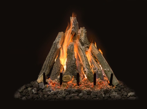 The Kiva Gas Log Burner is a true 7 burner featuring 6 vertical upright burners in the back and a single front burner that also acts as the ember bed. Embers are littered across the front of the burner and the uprights to give a trailing glow effect behind the logs. This burner features the Arizona Weathered Oak Kiva Log Set.