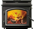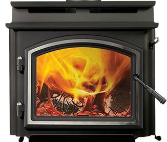 Quadra-Fire Classic black arched door with satin nickel trim, hinge pins and fiber handle